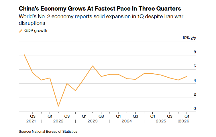 Bloomberg –  China’s Economy Rides Out War as Growth Unexpectedly Hits 5%