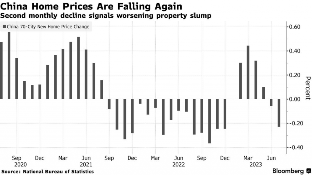 根据中国国家统计局(National Bureau of Statistics)今天发布的数据,7月中国70个城市的新房价格环比下滑0.23%,二手房价格下滑0.47%。
