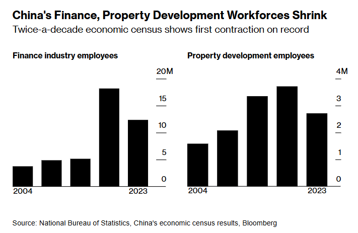 今天公布的数据显示,2023年末,金融行业的员工数量相比5年前缩水32%至1,240万人。地产开发商的员工数量,则暴跌27%至270万人。