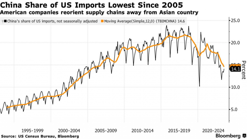 根据美国普查局(Census Bureau)最新报告,截至7月的一年中,来自中国的美国进口商品占比下跌到了14.6%,创下了2005年以来的新低。