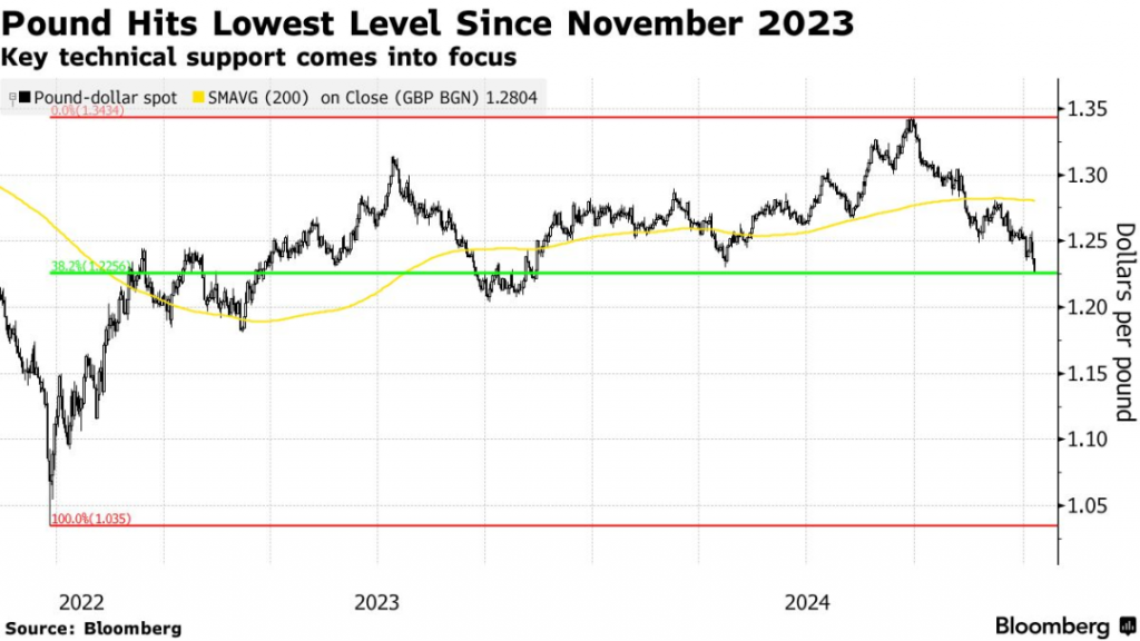 今天,英镑下滑最多1%至1.2239美元,创下了2023年11月以来的新低。10年期英国国债的收益率激增最多13基点至4.92%,英国重要股指FTSE 250下跌了4月以来最多的1.1%。