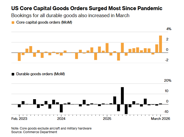 美国商务部周三公布的数据显示,3月核心资本货物订单(不包括飞机和军用硬件的商业设备投资指标)环比大幅增长3.3%,创下自2020年年中以来的最大单月增幅。此前2月份的数据也上修至增长1.6%。