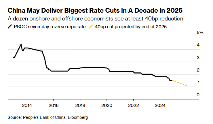 数十名海内外的经济学家预计,中国可能在2025年至少降息40基点