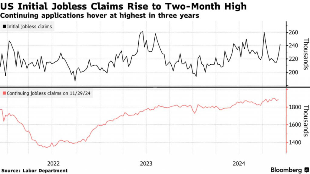 美国劳工部最新公布的数据显示,截至12月7日的一周内,初请失业金人数增加1.7万至24.2万人,超过经济学家预期中值22万。过去四周的移动平均值也有所上涨,美国大部分州都有上涨趋势。