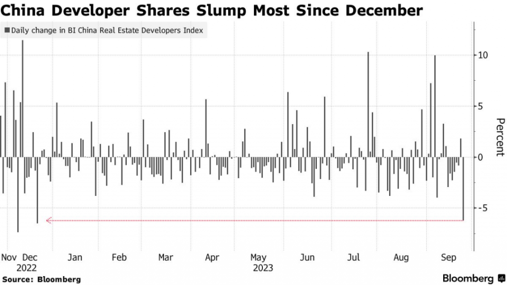 来源:Bloomberg – China Developers Drop Most in 9 Months on Evergrande Woes