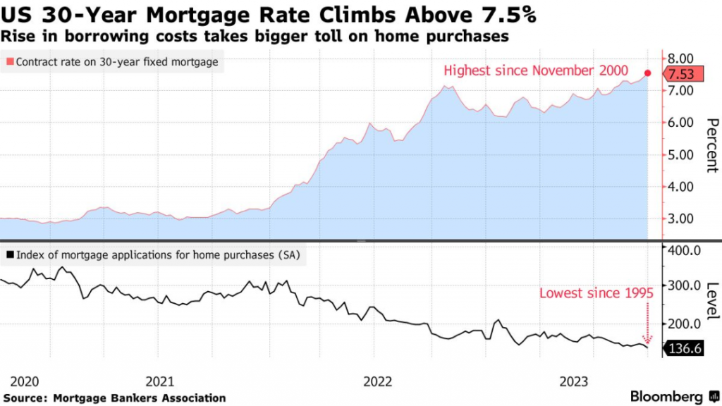 美国按揭抵押贷款银行家协会(MBA)今天发布的数据显示,30年期定息房贷利率上涨了12基点,并在2000年11月以来首次突破7.5%的水平。
