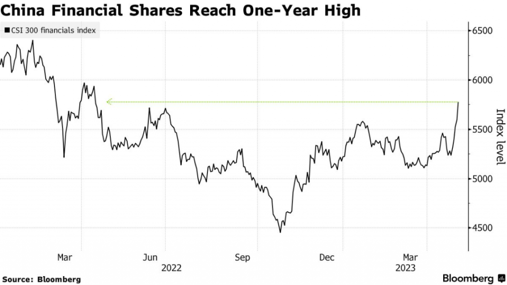 今天,跟踪中国各大银行股票的CSI 300金融指数连续第五天上涨,并且达到了2022年4月以来的新高,总市值增加超过$1,660亿美元。