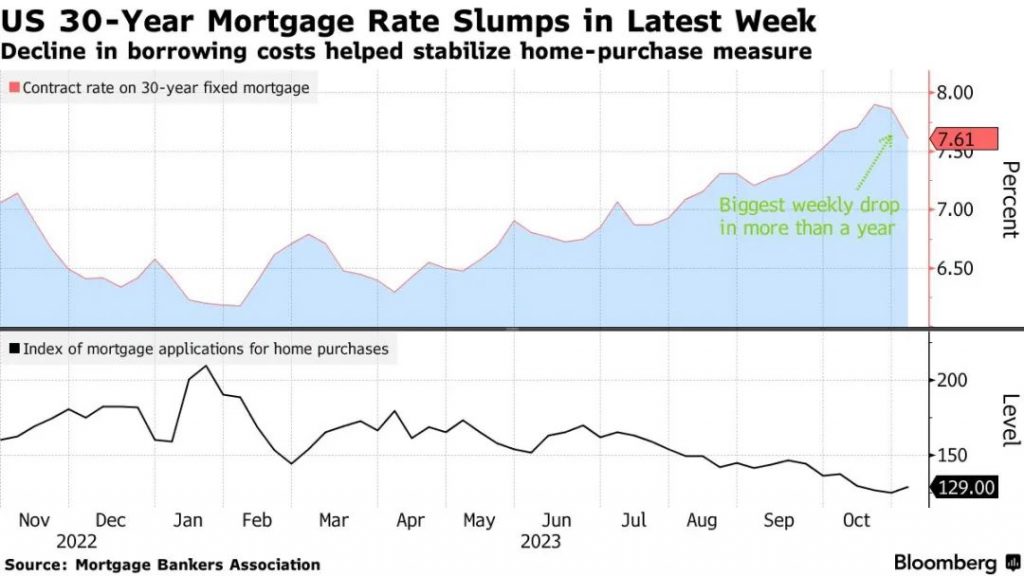 美国按揭抵押贷款银行家协会(Mortgage Bankers Association)最新数据显示,上周30年期房贷利率下跌25基点至7.61%,创下9月末以来的最低水平。