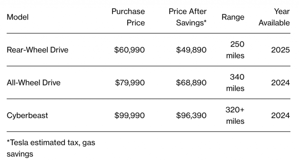 特斯拉还宣布最基础配置的Cybertruck将在2025年正式市售,价格为$60,990美元,比四年前给出的宣传价格高出50%。