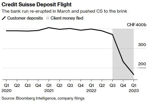 上个月,沙特重要股东宣布不会再为瑞士信贷提供资本支持,高净值以及零售客户对公司失去了信心,并随机取出了数十亿美元。对此,瑞士政府担心公司会走向破产,并决定促成瑞银收购瑞士信贷的交易。