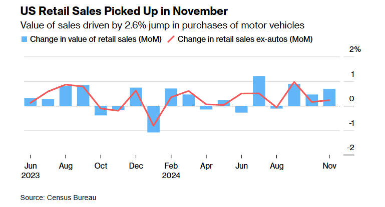 美国人口普查局今天公布的数据显示,11月未经通胀调整的零售销售总额,环比上涨0.7%,受益于汽车以及网络购物。除去汽车,零售销售额环比只增加了0.2%。