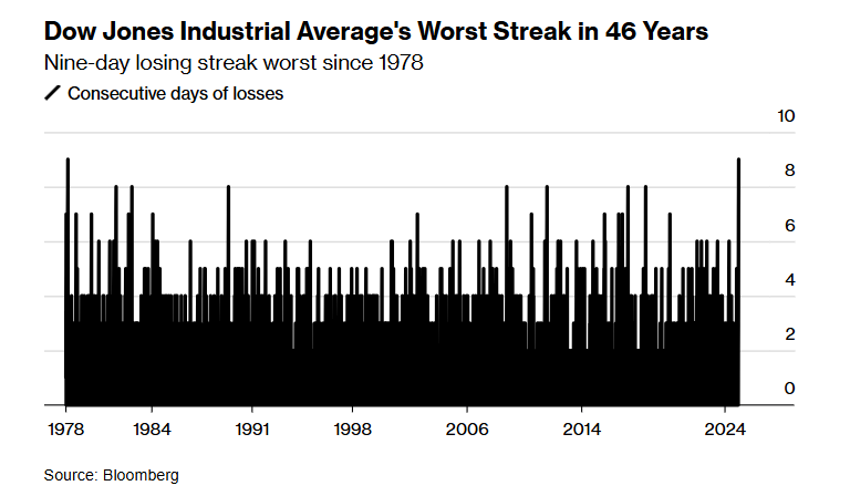 今天,美国道琼斯工业指数下滑0.6%,跌势已经持续了9个交易日,创下了1978年以来蓝筹股票指数的最长跌势,累计跌幅3.5%。同期内,标普500指数和纳斯达克100指数基本不变。