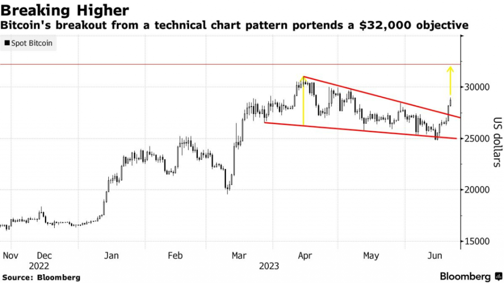 今天,最大加密货币比特币的价格最高上涨3%至$28,720美元,突破了5月以来最高水平,今年累计回弹74%。