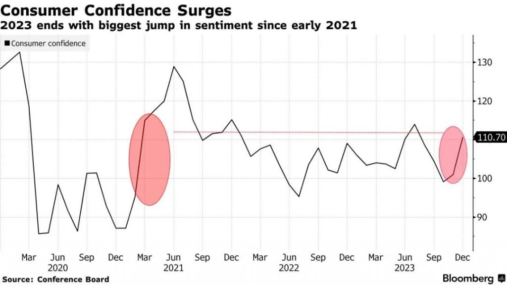 美国世界大型企业联合会(Conference Board)今天发布的数据显示,12月消费者信心指数从11月的101激增到了110.7,创下了2021年初以来最大的涨幅。
