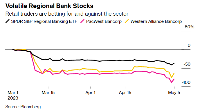 上周包括PacWest在内的几家小银行股价暴跌,但在周五大幅回弹。KBW地区银行指数开盘时还上涨了1.9%,但最终以2.8%的跌幅收盘。