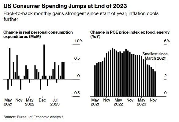 除去通货膨胀影响的消费者开支,在12月上涨了0.5%,并创下了一年以来最多的两个月涨幅,主要受益于薪资的增长。