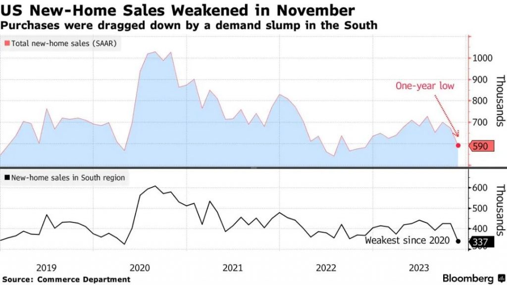 今天美国政府公布的数据显示,11月新单户家庭住宅的销量意外大跌12.2%至年化59万户,低于经济学家预期的69万。其中,美国最大的南部市场下跌最多,跌幅达到了21%。