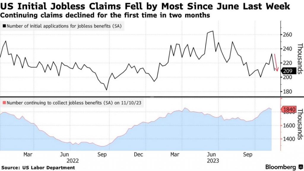 美国劳工部今天发布的数据显示,截至11月18日的一周内初请失业金人数大跌2.4万人至20.9万,创下了6月以来最大跌幅。