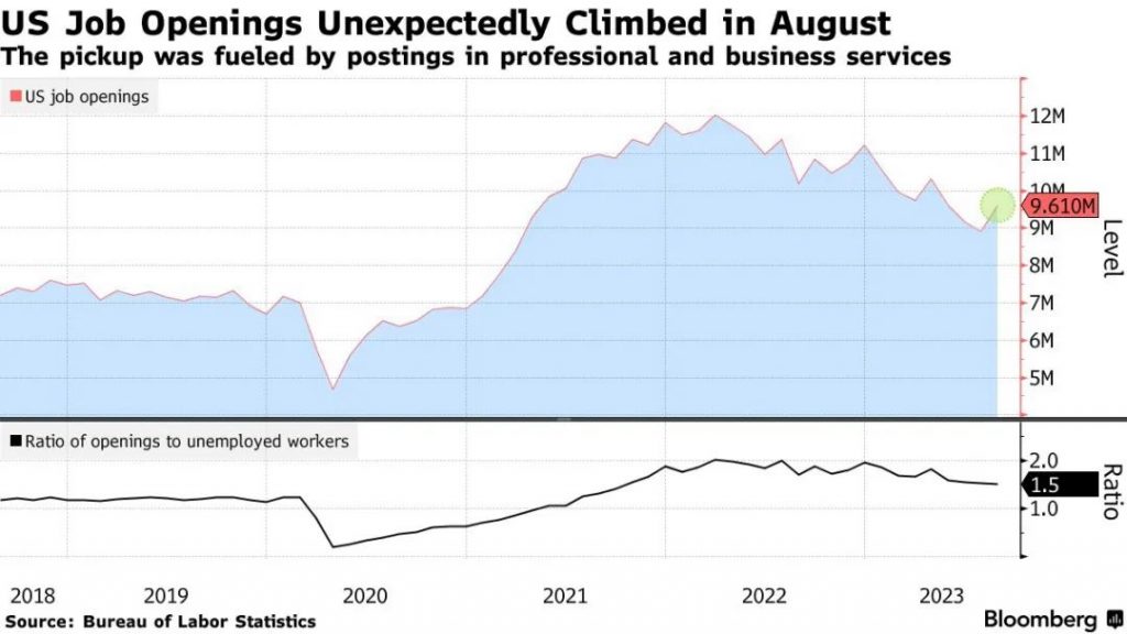 美国劳工统计局今天发布的数据显示,8月美国空缺岗位数量意外上涨至961万个,其中白领岗位是涨幅的主要驱动力。