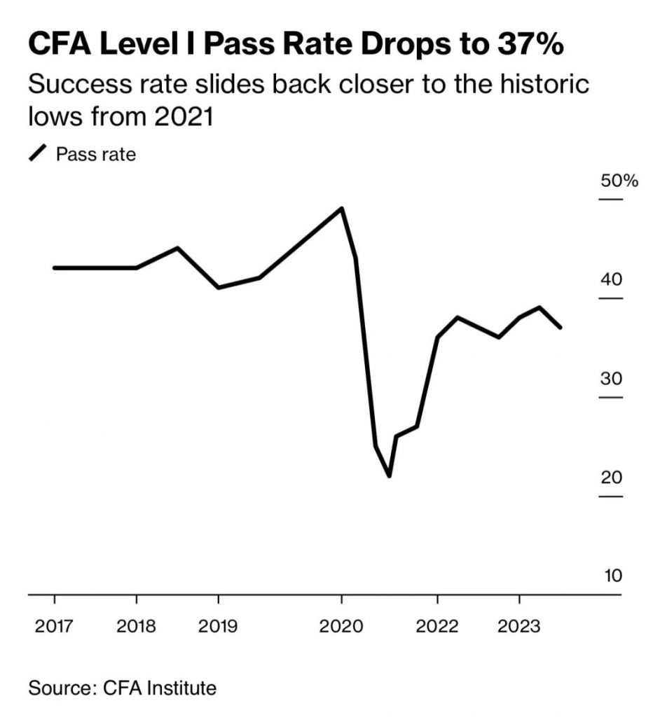 CFA Institute今天发布的数据显示,8月CFA一级考试的通过率从5月的39%下跌到了37%,并低于过去10年平均的41%。