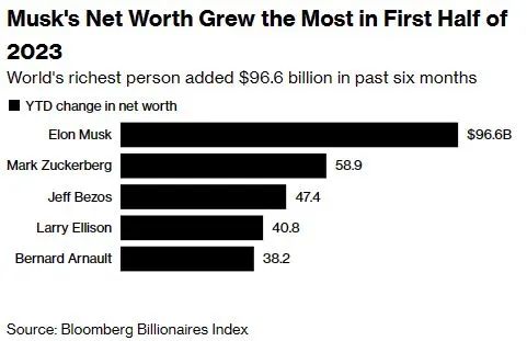 目前的全球首富马斯克,总计增加了$966亿美元的资产。Meta创始人马克·扎克伯格获得了$589亿美元。