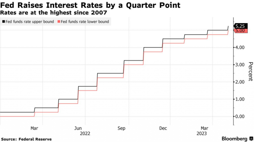 目前,联邦基准利率已经上涨到了5%至5.25%,创下了2007年以来最高。委员会成员全票通过涨息25基点。