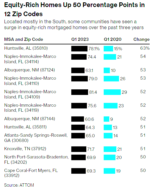 股本比率最多的50个地区都位于加州、佛罗里达、纽约,以及德克萨斯