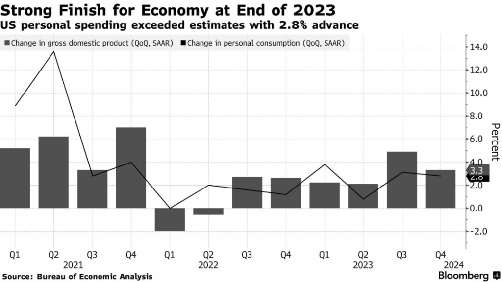 美国政府今天发布的初步预期数据显示,去年第四季度内美国GDP增长速度意外达到了年化3.3%,2023全年的增长率为2.5%。