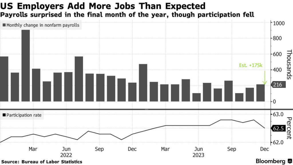 今天美国劳工统计局公布的数据显示,12月美国非农就业人数增加了21.6%,失业率维持在3.7%,但是参加工作的总人数有所缩水。相比11月,平均时薪增加了0.4%。