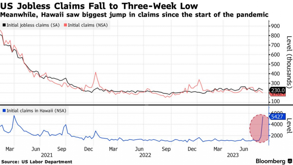 来源:Bloomberg – US Jobless Claims Drop to 230,000, Lowest in Three Weeks