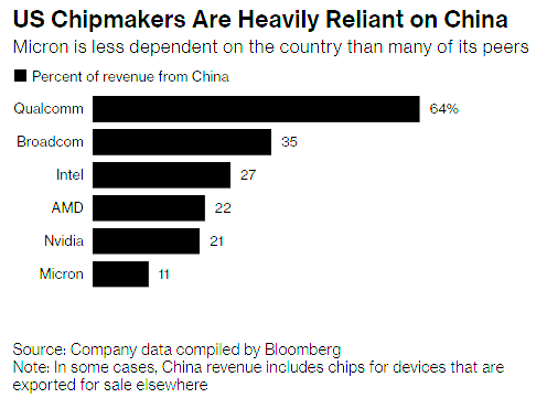 高通等美国芯片公司非常依赖中国市场,但Micron中国收入占比相对较少