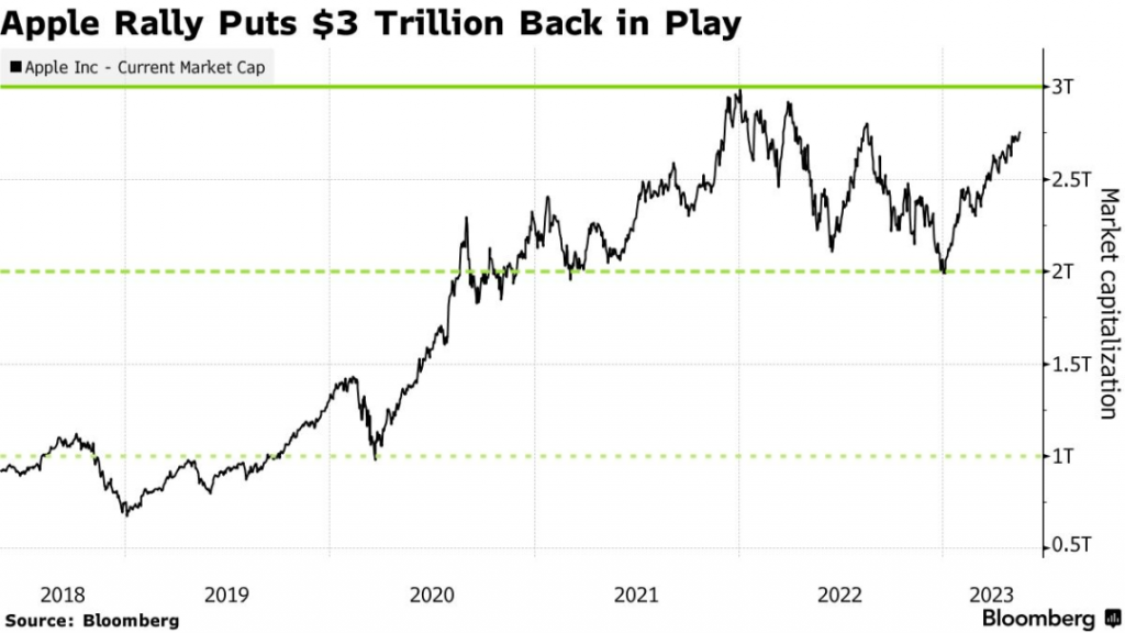 年初至今,苹果(Apple)的股价已经累计上涨35%,市值增加近$6,900亿美元,因为投资者非常青睐苹果稳定的收入和丰厚的现金储蓄。目前,苹果的股价也非常接近2022年1月的历史最高点。