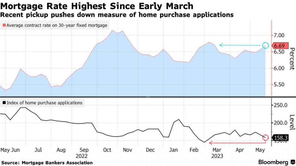 美国按揭抵押贷款银行家协会(MBA)今天发布的数据显示,30年期定息房贷平均利率上涨12个基点至3月以来最高的6.69%。截至5月19日的一周内,购房申请指数下跌4.3%,同样跌至3月初以来新低。