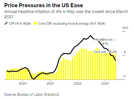 美国劳工统计局最新数据显示,今年5月美国CPI年同比上涨4%,创下了2021年3月以来最小涨幅。