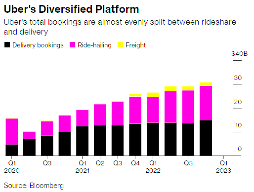 优步叫车和外卖的收入近乎对半分,送货收入占比较小