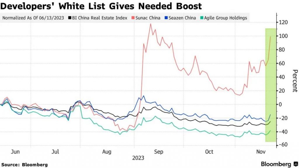 来源:Bloomberg – China Property Stocks Surge, With Sunac Rallying 27%, After Beijing Picks 50 Firms to Fund