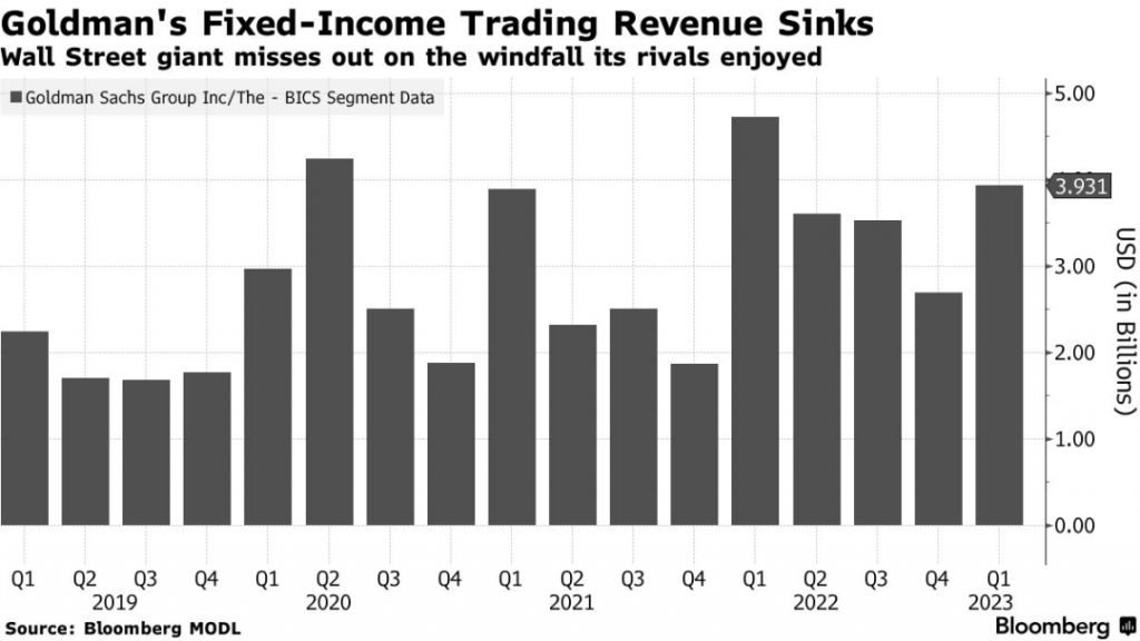 高盛未能利用好固定收益交易好时机,目前是行业唯一交易收入下滑的公司