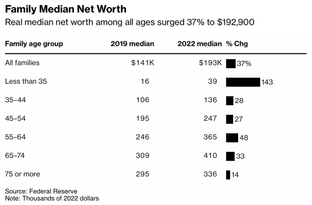 数据还显示,全部年龄段美国人的中位净资产都有所上涨,其中35岁以下人群资产甚至翻倍。