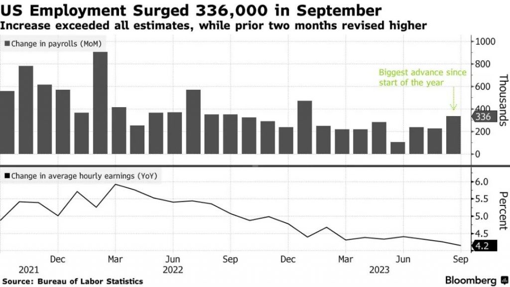 美国劳工统计局今天发布的数据显示,9月美国非农就业人数增加了33.6万人,创下了年初以来最高并且超过经济学家预期。