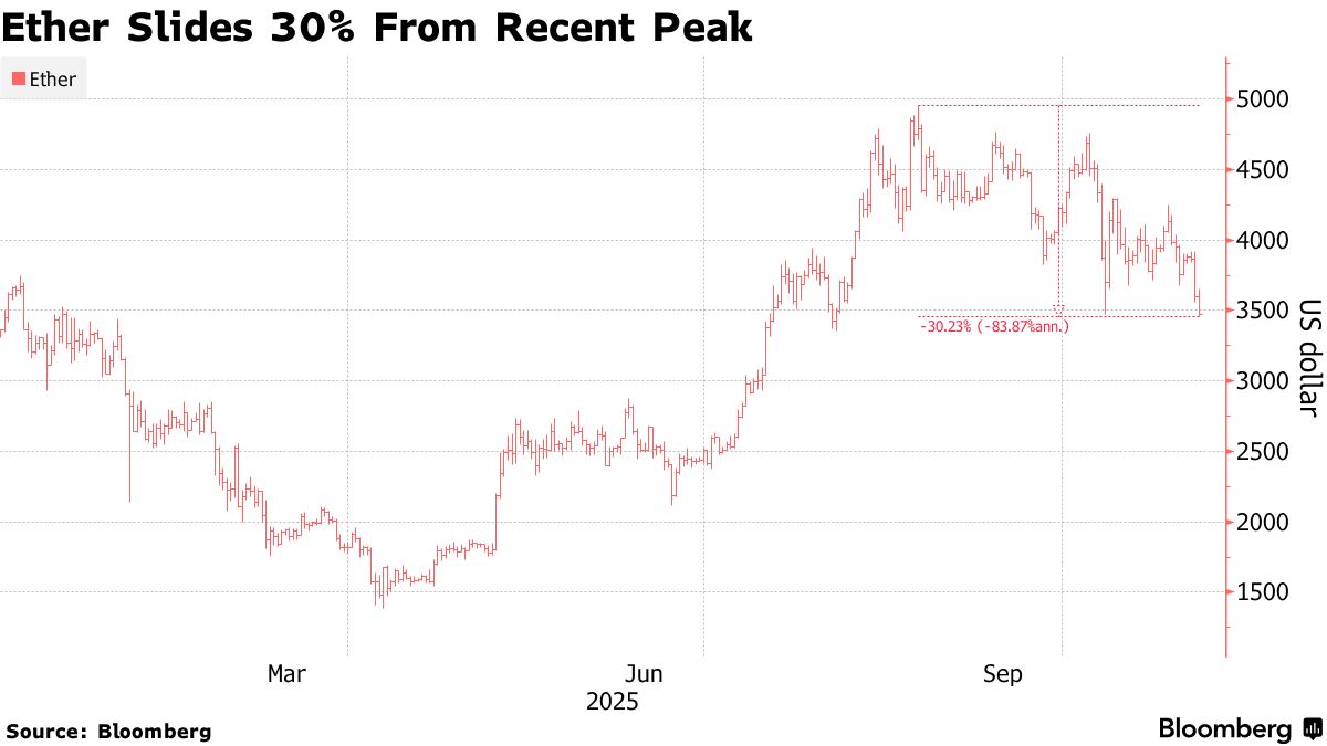 The world’s second-largest cryptocurrency fell below $3,400 on Tuesday, sliding alongside Bitcoin and major tech stocks as Wall Street’s AI-driven optimism faded. Ether is now down about 30% from its August peak, erasing gains made during a wave of corporate accumulation and signaling its return to a bear market.