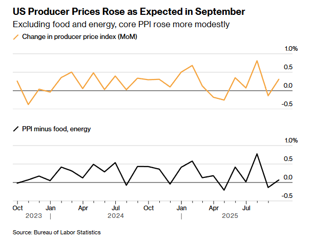 US wholesale inflation picked up in September as rising energy and food costs outweighed softer increases in other consumer goods. The producer price index (PPI) rose 0.3% from the prior month, matching economists’ expectations, according to the Bureau of Labor Statistics. Core PPI — excluding food and energy — rose less than forecast and increased 2.6% from a year earlier, the smallest annual gain since July 2024. The report, originally scheduled for Oct. 16, was delayed due to the government shutdown, and the BLS has not yet provided a date for the October PPI release.