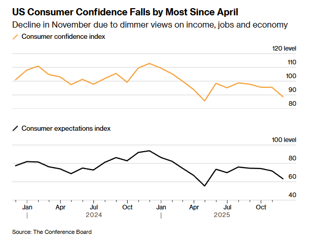 US consumer confidence dropped in November by the most in seven months as concerns about the labor market and the broader economy intensified. The Conference Board’s index fell 6.8 points to 88.7, according to data released Tuesday — weaker than every estimate in a Bloomberg economist survey. The expectations index slid to its lowest level since April, while the gauge of current conditions fell to a more-than-one-year low.