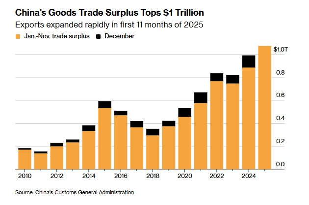 As China navigated the trade war and growing economic protectionism around the world, the country amassed a surplus of $1.1 trillion in the first 11 months of the year, surpassing the full-year record set in 2024.