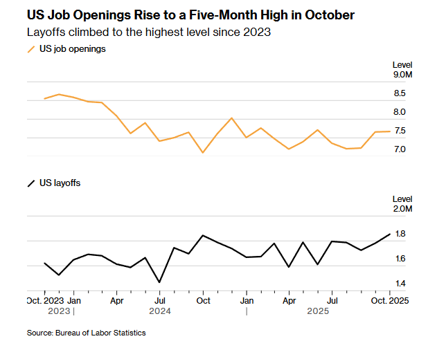 Meanwhile, the number of layoffs in October rose to 1.85 million, the highest since early 2023. Dismissals increased in leisure and hospitality and in manufacturing. Hiring declined by 218,000 from the month prior to 5.15 million.