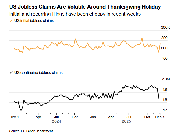Initial jobless claims increased by 44,000 to 236,000 in the week ended Dec. 6, Labor Department data showed Thursday. That was the largest weekly rise since March 2020 and followed the lowest level of claims in more than three years during the previous week, which included the Thanksgiving holiday. The figure exceeded all but one estimate in a Bloomberg survey of economists. Claims tend to be choppy around holidays and will likely continue fluctuating through year-end, but this reading is at the upper range of 2025 levels.