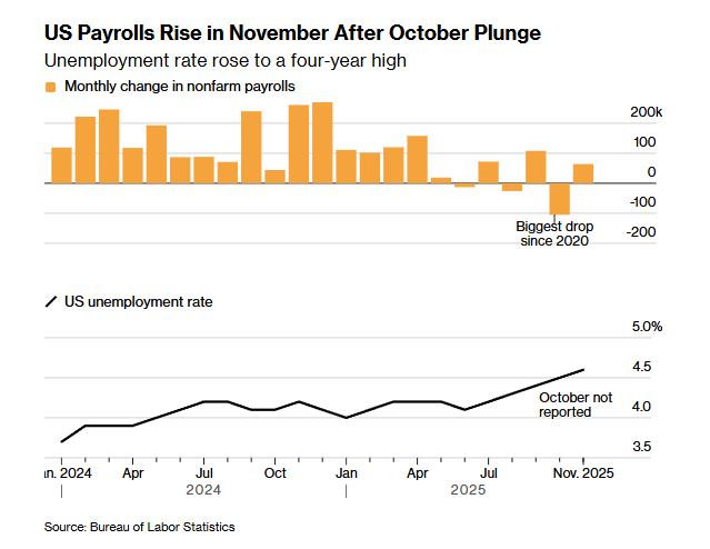 Nonfarm payrolls increased by 64,000 in November after falling 105,000 in October, according to Bureau of Labor Statistics data released Tuesday. The unemployment rate rose to 4.6% from 4.4% in September. The BLS didn’t publish an October jobless rate because it couldn’t retroactively gather data after the government shutdown.