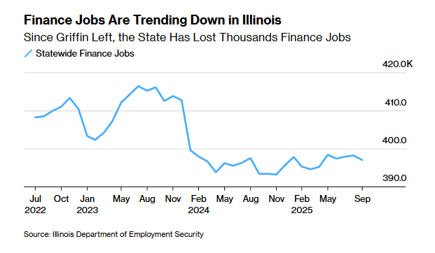 The local job market has weakened as well — Illinois finance-sector employment has fallen 2.7% since Griffin’s departure, to 397,000 roles as of September. This represents a significant setback for a city historically central to the global derivatives industry and home to CME Group and Cboe Global Markets.