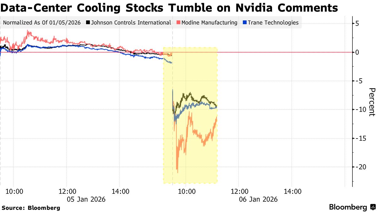 Shares of data center cooling equipment makers plummeted on Tuesday following comments from Nvidia CEO Jensen Huang at CES 2026. Trane Technologies saw its stock tumble as much as 11% in its worst intraday decline since 2020, while Modine Manufacturing fell 21%. Industry peers Johnson Controls and Carrier Global also recorded significant losses as investors reacted to potential shifts in AI infrastructure design.