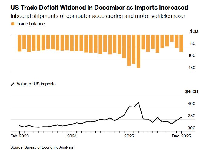 The US trade deficit widened to $70.3 billion in December, according to Commerce Department data released Thursday, capping a turbulent year defined by erratic tariff policies. The full-year deficit for 2025 totaled $901.5 billion, slightly lower than the $903.5 billion recorded in 2024 but remaining one of the largest shortfalls since records began in 1960. The December jump reflected a 3.6% increase in imports to $357.6 billion, while exports of goods and services fell 1.7% to $287.3 billion, far exceeding the median economist estimate of a $55.5 billion gap.