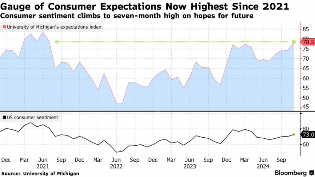 According to Bloomberg’s survey of economists, U.S. consumer confidence reached a seven-month high of 73 in early November, surpassing nearly all economists’ expectations. The index reflecting consumer expectations for the future economy rose to 78.5, the highest level since mid-2021.